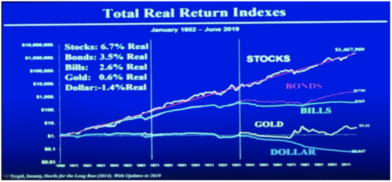 Behavior based investing fonds i.o. belegt voor u om een stabiel en duurzaam rendement te behalen. In onderstaande afbeelding ziet u dat sinds 1802 aandelen (stocks) het steeds beter hebben gedaan in vergelijking tot obligaties (leningen aan de staat), spaarrekeningen, goud en de dollar. Wij kiezen daarom voor aandelen in de meest duurzame bedrijven. Bedrijven die al tientallen jaren grote winsten laten zien die... in uw portemonnee terecht komen. U bent als aandeelhouder immers mede eigenaar van de onderneming.